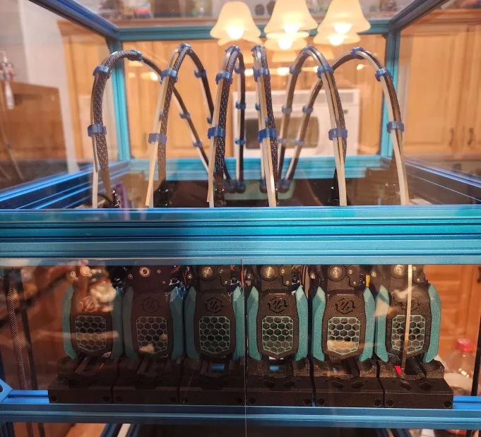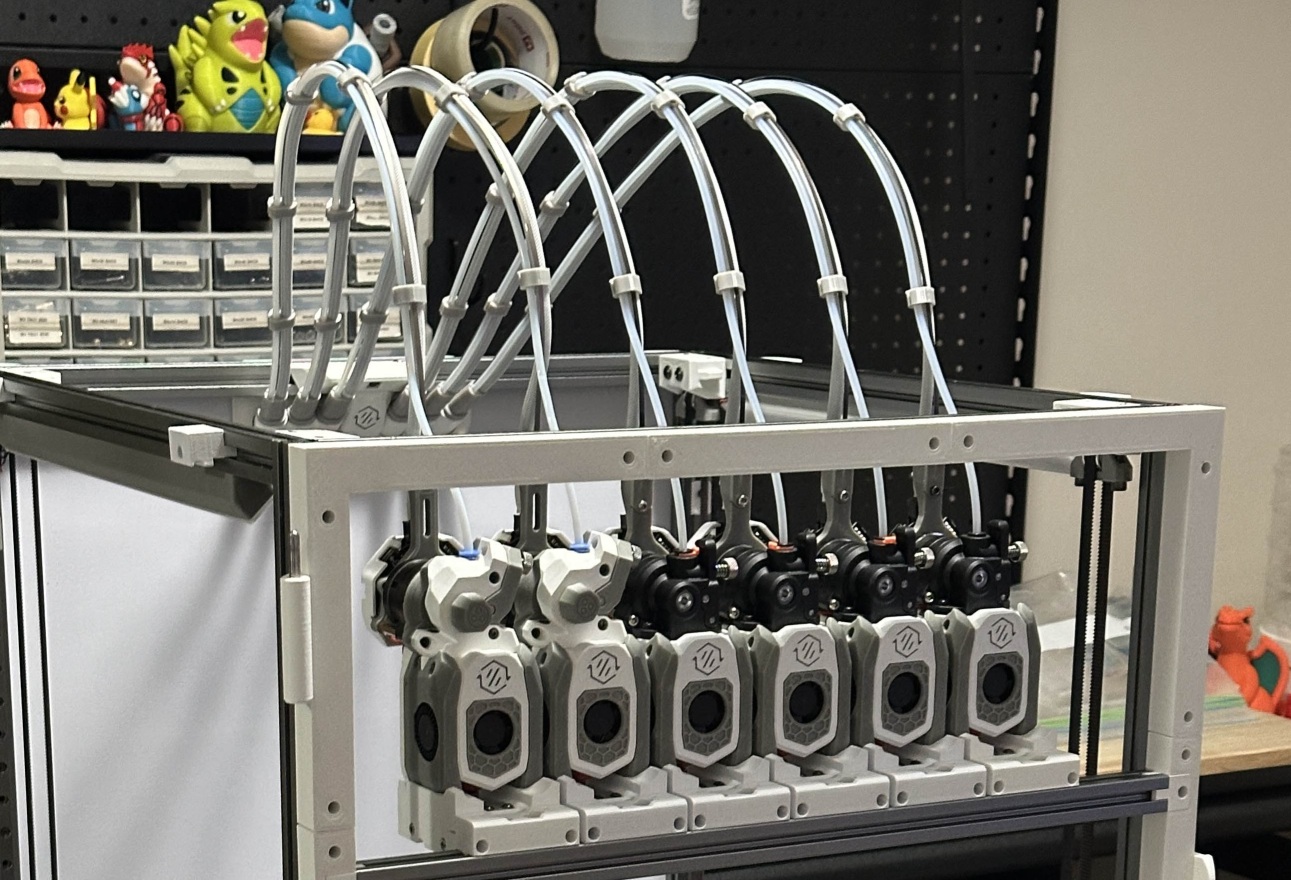 Each tool uses a separate toolhead PCB that provides power and communication (either via CAN or USB). With several toolheads this quickly adds up in terms of spaghetti and can hook behind the frame or each other, tossing toolheads out of their docks or out of the shuttle if they are not properly managed.